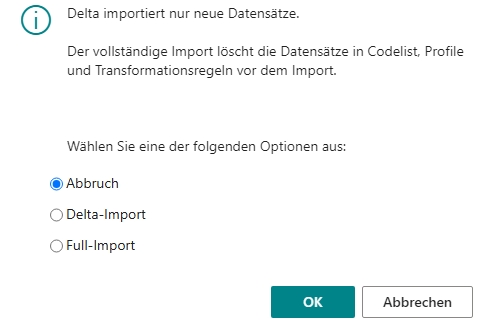 Delta-Import EmpfohlDer Delta-Import ergänzt neue Datensätze, bestehende Datensätze in den oben genannten Tabellen werden nicht geändert.